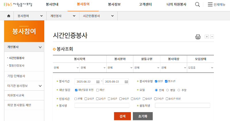 로그인 후 메인화면에서 '봉사참여 → 봉사정보 검색' 메뉴를 통해 본인의 관심 분야 및 지역에 맞는 봉사활동을 검색할 수 있습니다. 원하는 활동을 선택해 신청하면 참여가 가능합니다.