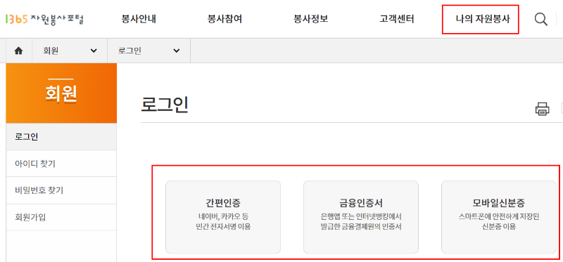 1365 자원봉사를 이용하려면 먼저 회원가입이 필요합니다. 홈페이지 우측 상단에서 회원가입을 선택 후, 휴대폰 또는 공동인증서 인증을 통해 가입할 수 있습니다. 이후 로그인하여 다양한 서비스를 이용할 수 있습니다.
